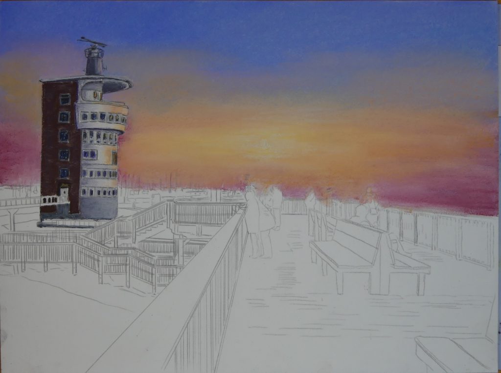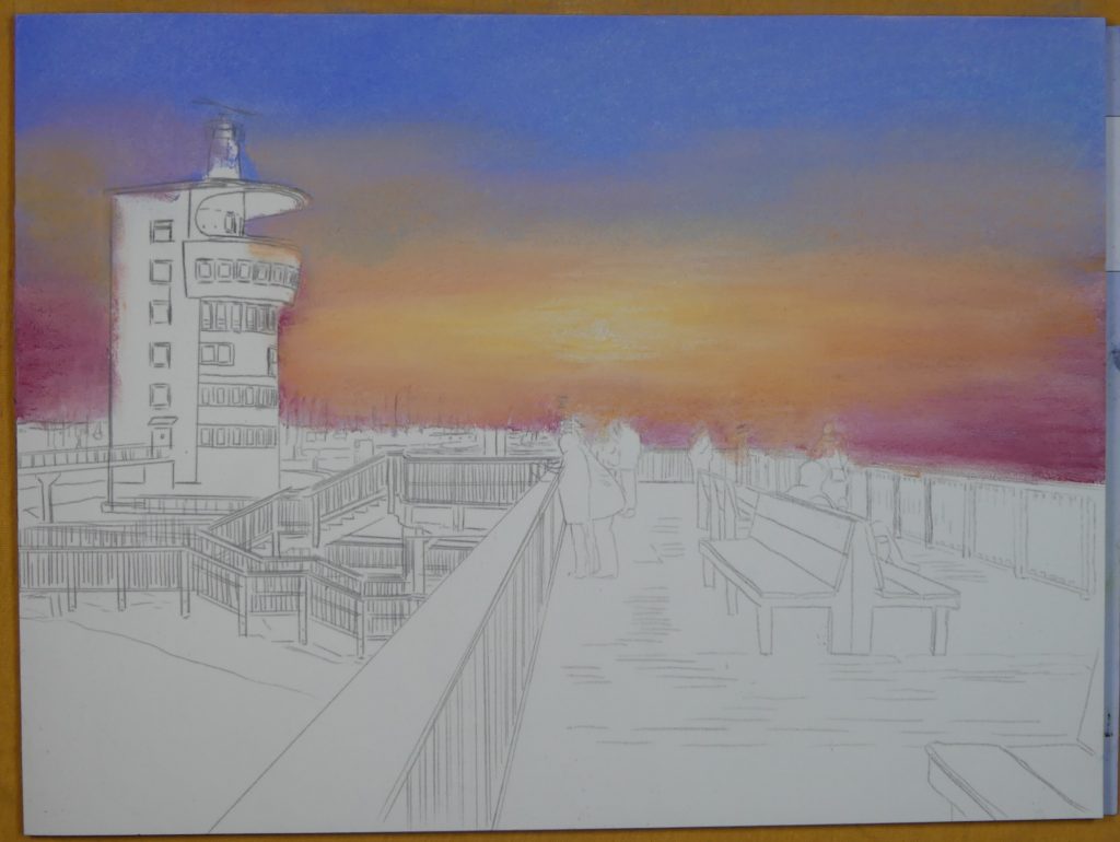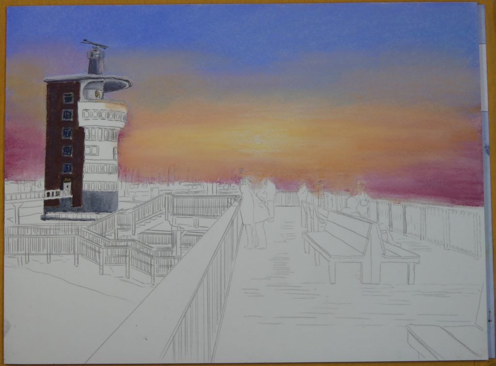 Das Licht der untergehenden Sonne lässt die Front des Turms leuchten, darum deute ich die Farben des Sonnenuntergangs in diesem Bereich an.