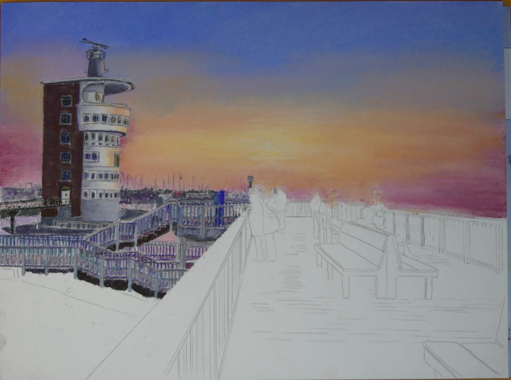 Als nächstes widme ich mich dem Radarturm. Zuerst vergegenwärtige ich mir, dass im Sonnenuntergang die Farben durch das Gegenlicht deutlich dunkler als am hellen Tag erscheinen lassen. Darum lege ich den Backstein in dunklem Braun an. Die hellen Partien des Radarturms male ich in verschiedenen Grautönen. Besonders dunkle Bereiche verstärke ich durch die Verwendung von dunklem Violett und vereinzelt Schwarz.