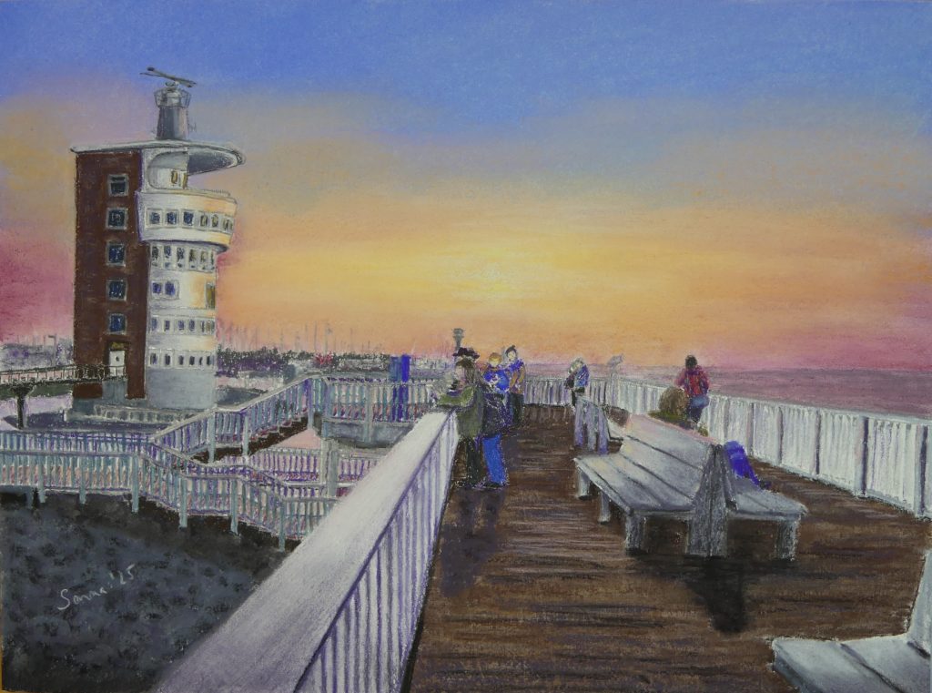 Die Gesichter der Menschen auf der Alten Liebe habe ich die trotz des Gegenlichts der untergehenden Sonne hell und für den Betrachter gut erkennbar gemalt Denn nur so wird das Bild interessant. Es verdeutlicht, dass sich keiner von ihnen in dem festgehaltenen Moment dem Naturschauspiel widmet. Sondern nur Du als Betrachter der Szenerie der Einzige bist, der die tolle Lichtstimmung genießt.